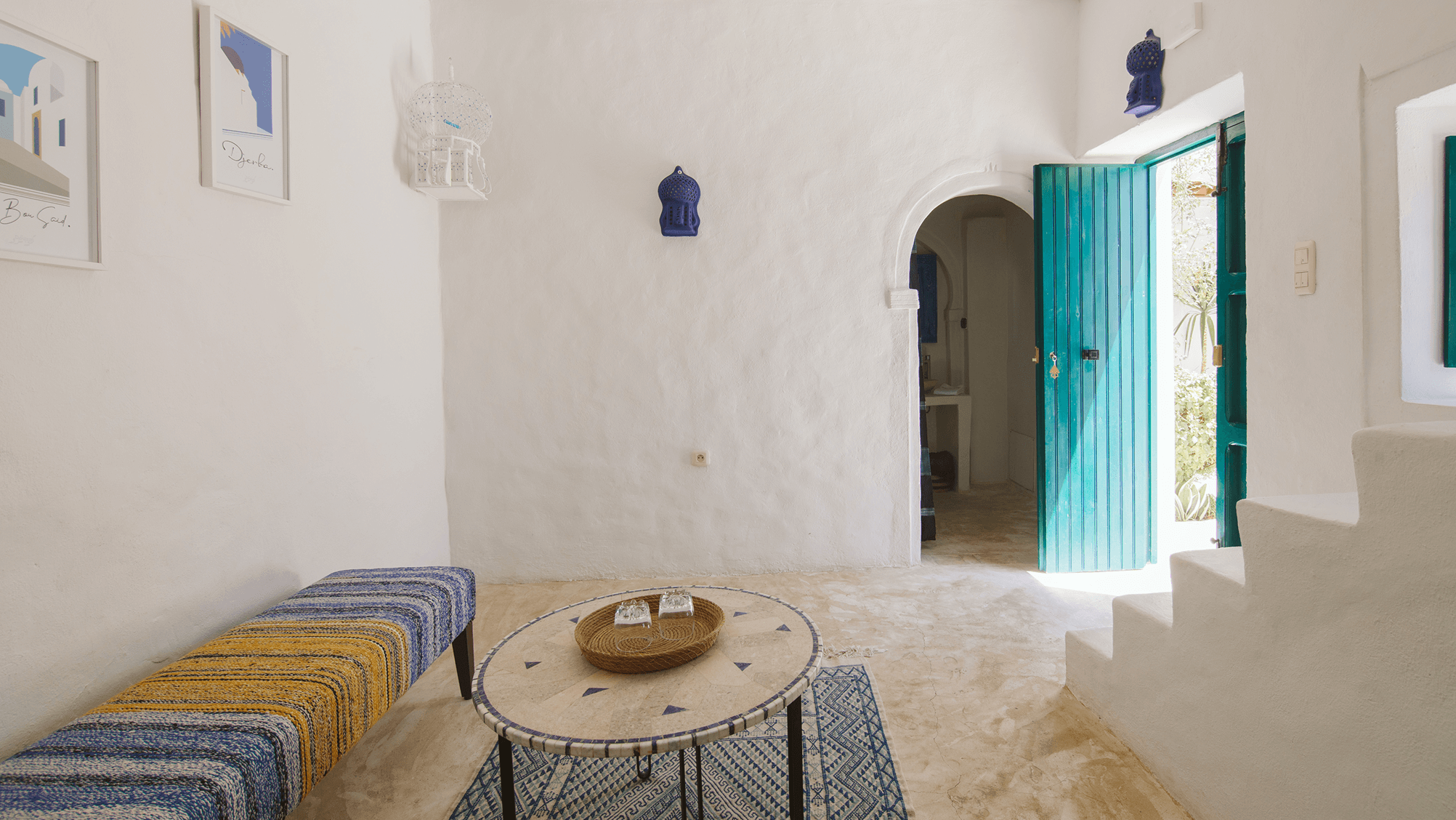 À l'ombre d'un palmier, sur la terrasse de l'étage ou dans le salon, il est possible de se détendre, un thé à la menthe dans la main. En été, le soleil inonde les lieux, créant une atmosphère lumineuse et chaleureuse. En hiver, la chaleur de la cheminée dans le salon ajoute une touche réconfortante, invitant à la convivialité. Le salon, véritable cœur de la maison, est un espace où chaque détail, signé par des artisans tunisiens, raconte une histoire.