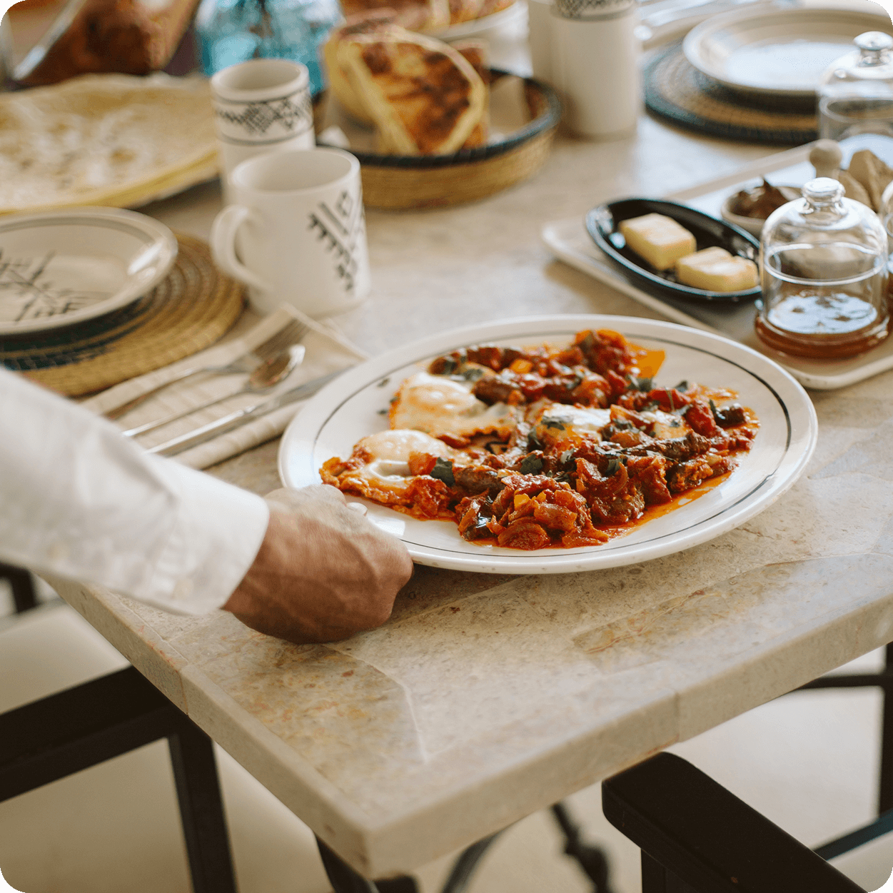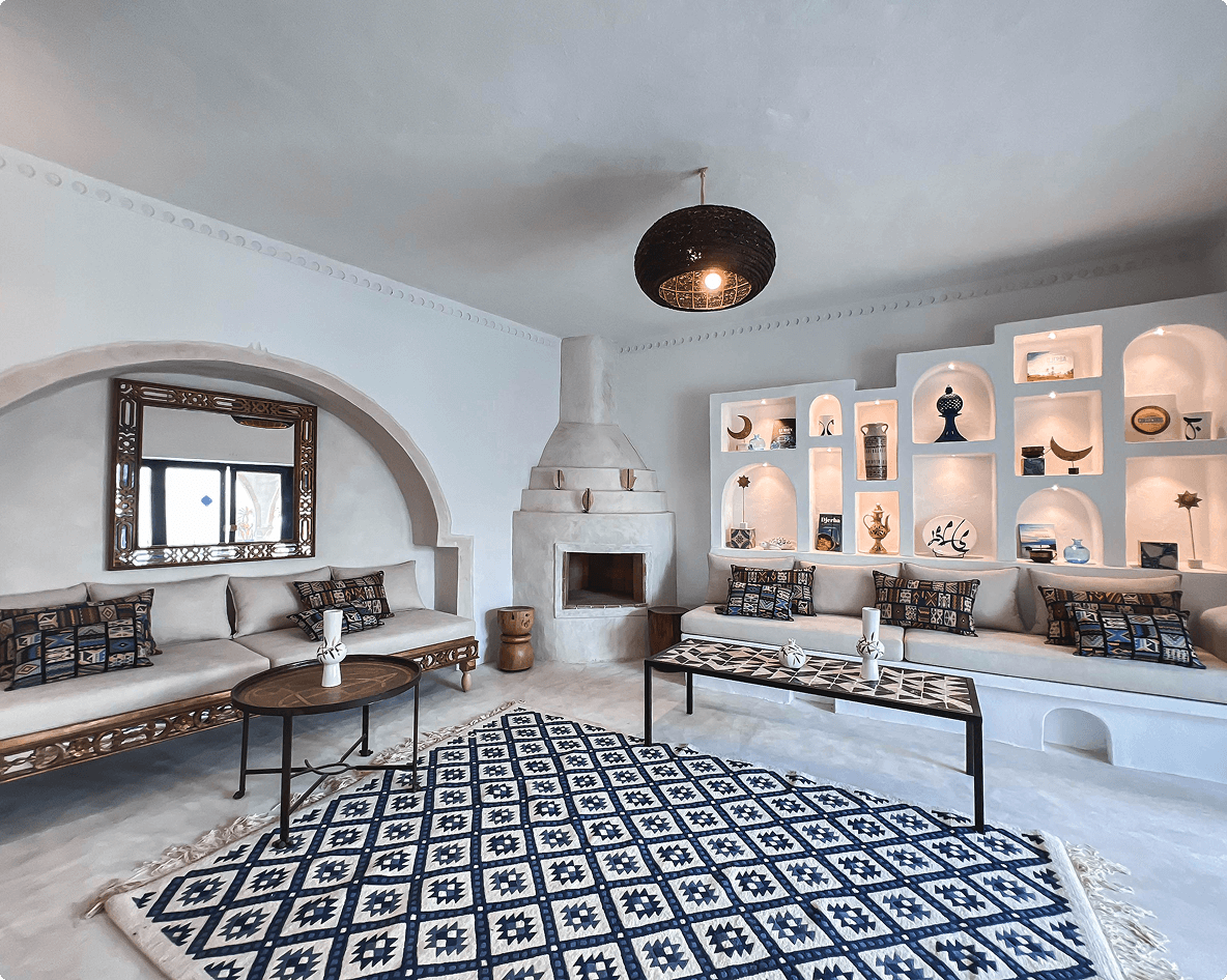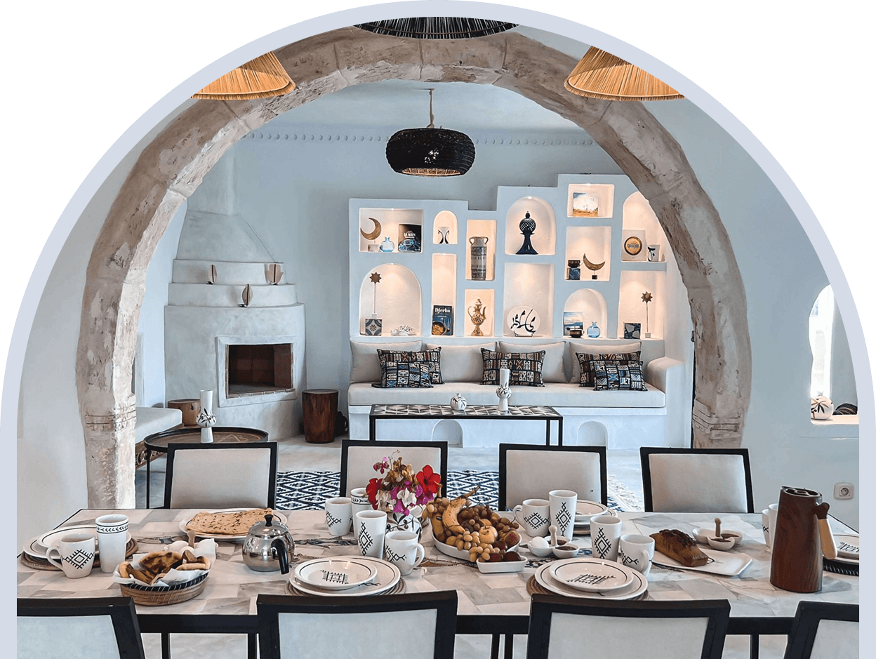 Construite et décorée à 100% par des artisans tunisiens, Dar Naël met en valeur le savoir-faire local à travers chaque élément de sa conception et de son ambiance. De la structure à la décoration, jusqu’à l’équipe sur place, tout a été pensé pour vous offrir une expérience unique et authentique.